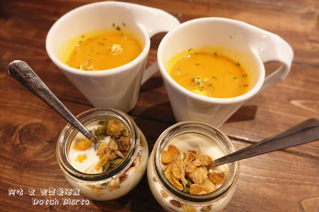 季節湯品是以南瓜、地瓜、紅蘿蔔與牛奶為食材熬煮而成的濃湯,香氣撲鼻怡人,多種食材融合後呈現了自然甘味,湯裡的爆玉米花與玉米則使口感更為豐富。
