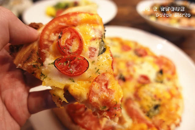 比薩餅皮屬於外酥內軟有嚼勁的類型,咀嚼時散發出橄欖油與麵粉淡香。