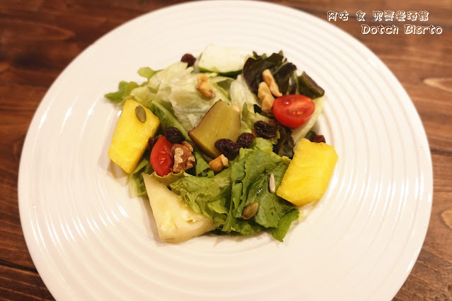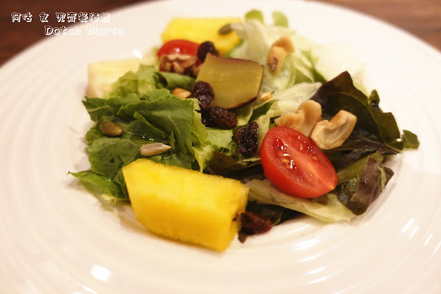內容有地瓜、小蕃茄、西瓜、葡萄乾、芭樂、鳳梨、堅果與多種生菜,未附醬汁,以品嘗其天然原味為主,各種果菜皆非常新鮮,水果類食材的酸與甜為整道沙拉做了最自然的調味。