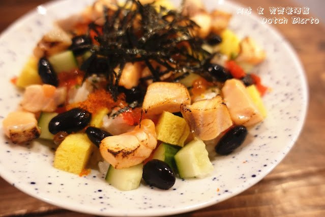 微酸開胃的冷醋飯鋪上多種食材:炙燒鮭魚塊、玉子燒、鮭魚卵、飛魚卵、黑豆、小黃瓜與海苔絲,分量都不少。