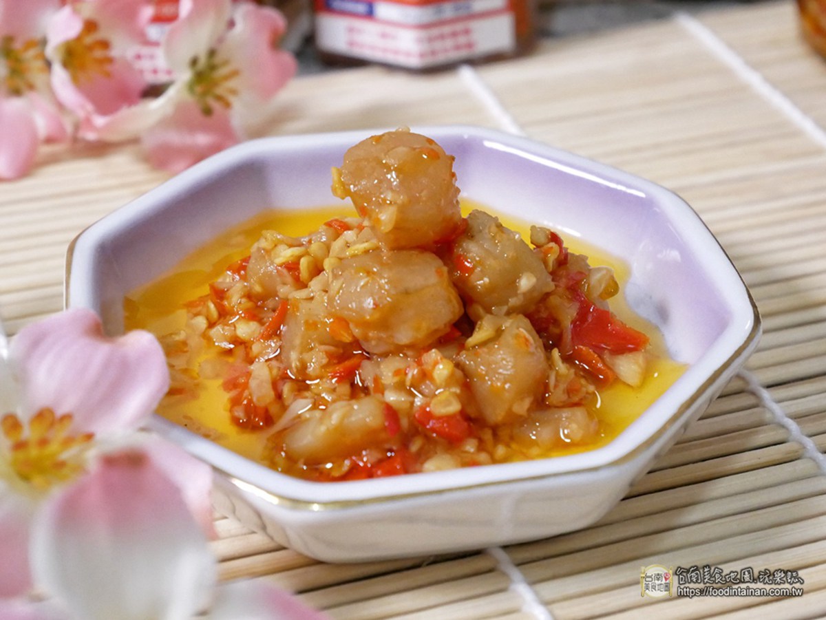 選用嘉義布袋干貝加上飛魚卵,炒製的干貝飛魚卵。Q軟的干貝伴隨彈勁十足的飛魚卵,鮮辣開胃!