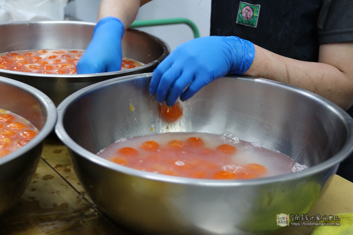 掌糕點每一顆蛋黃酥裡的紅土鹹鴨蛋黃,都是手工一顆顆敲打出來,再經過浸泡、烘烤而成。