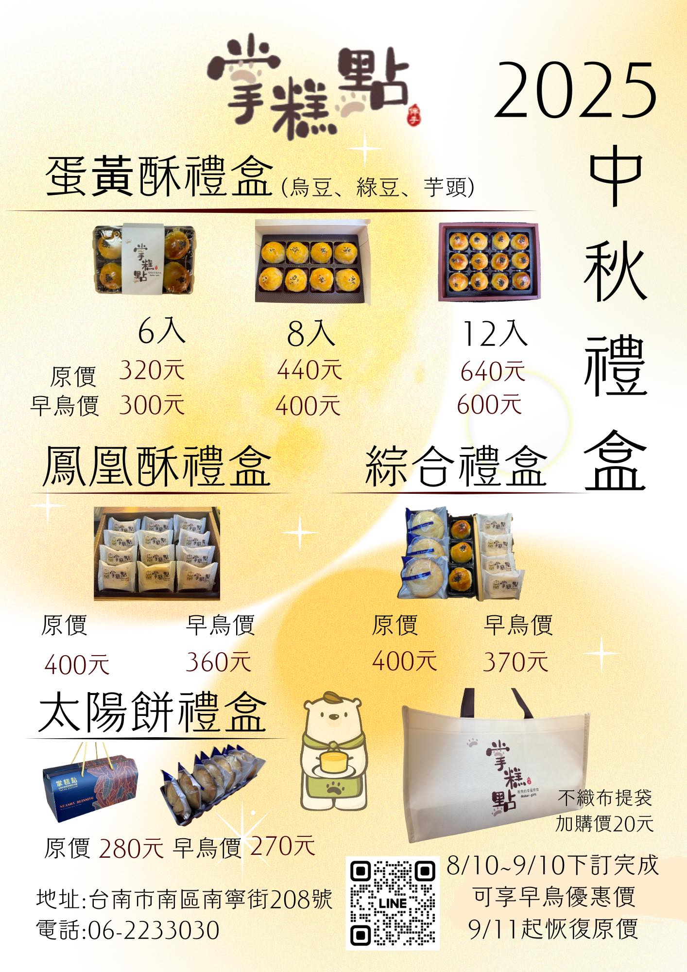 掌糕點不僅販售傳統手撕蛋糕,逢年過節應景的中秋禮盒蛋黃酥鳳凰酥太陽餅也別錯過!今年更推出可重複使用的不織布提袋,送人環保好用最實在!