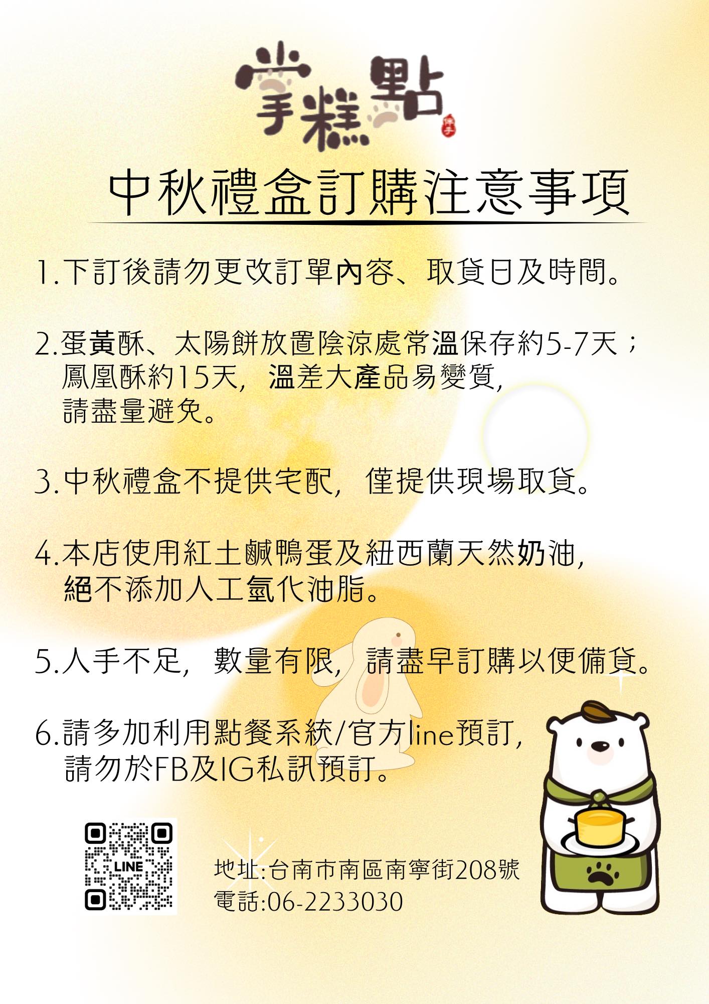 • 蛋黃酥、鳳凰酥、太陽餅無法久放請盡速食用完畢
