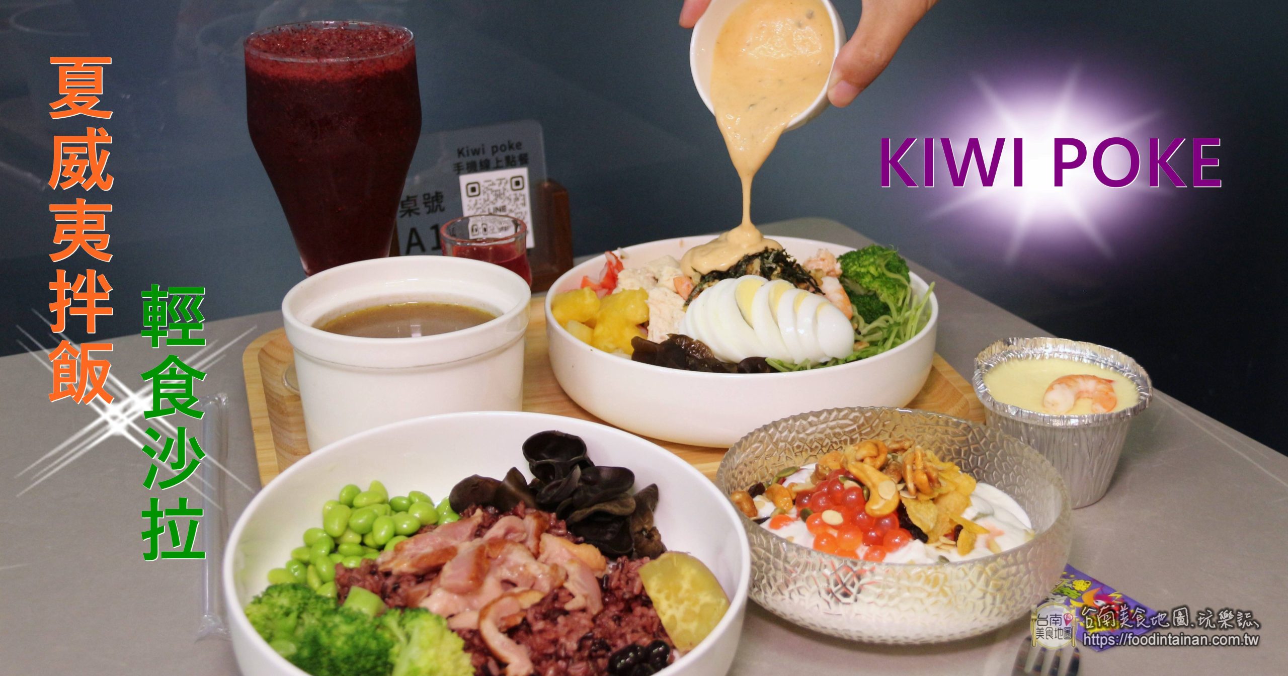 台南輕食推薦Kiwi poke 夏威夷拌飯/輕食沙拉/鮮果酵素!選用當季水果、及新鮮蔬菜等水煮的無油配餐,自由選近10種海鮮或雞豬牛肉主食,再淋上獨家醬汁的低熱量美味健康餐。亦可客製百元養生餐,輕鬆享食美麗一夏的好選擇~…