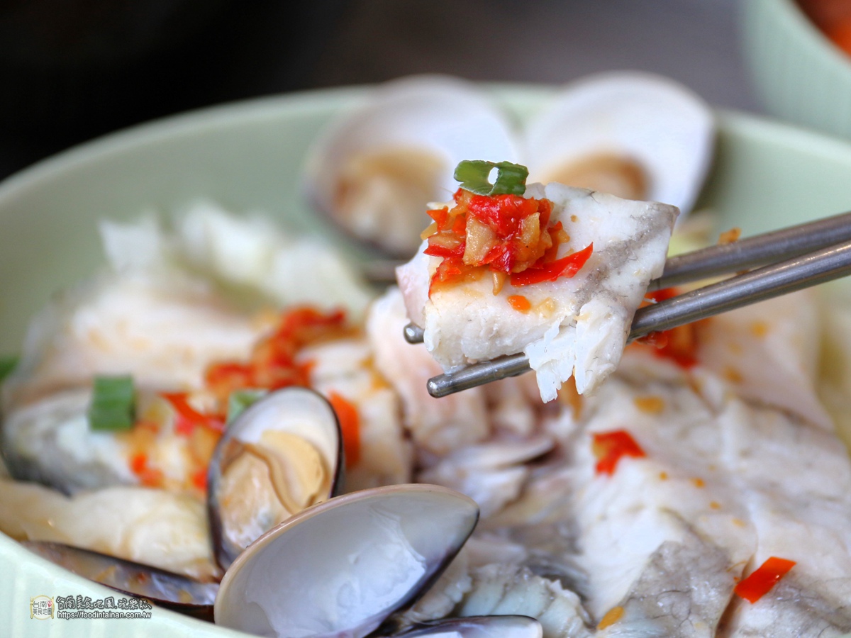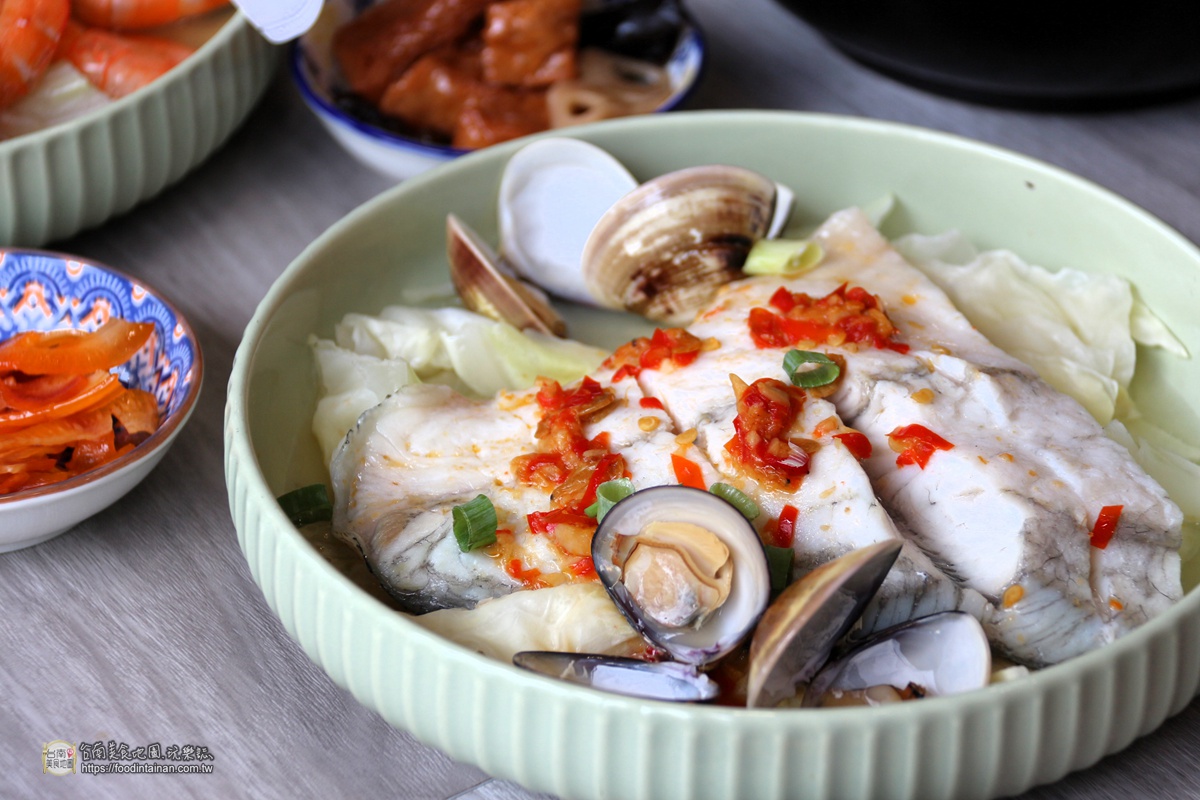 去骨的新鮮海鱸魚肉及蛤蜊,放在高麗菜和金針菇上,再清蒸而成的金沙海鱸魚佐季節時蔬。原汁原味的鮮美滋味,佐以OEM的金沙蝦米辣椒醬,簡單又夠味!