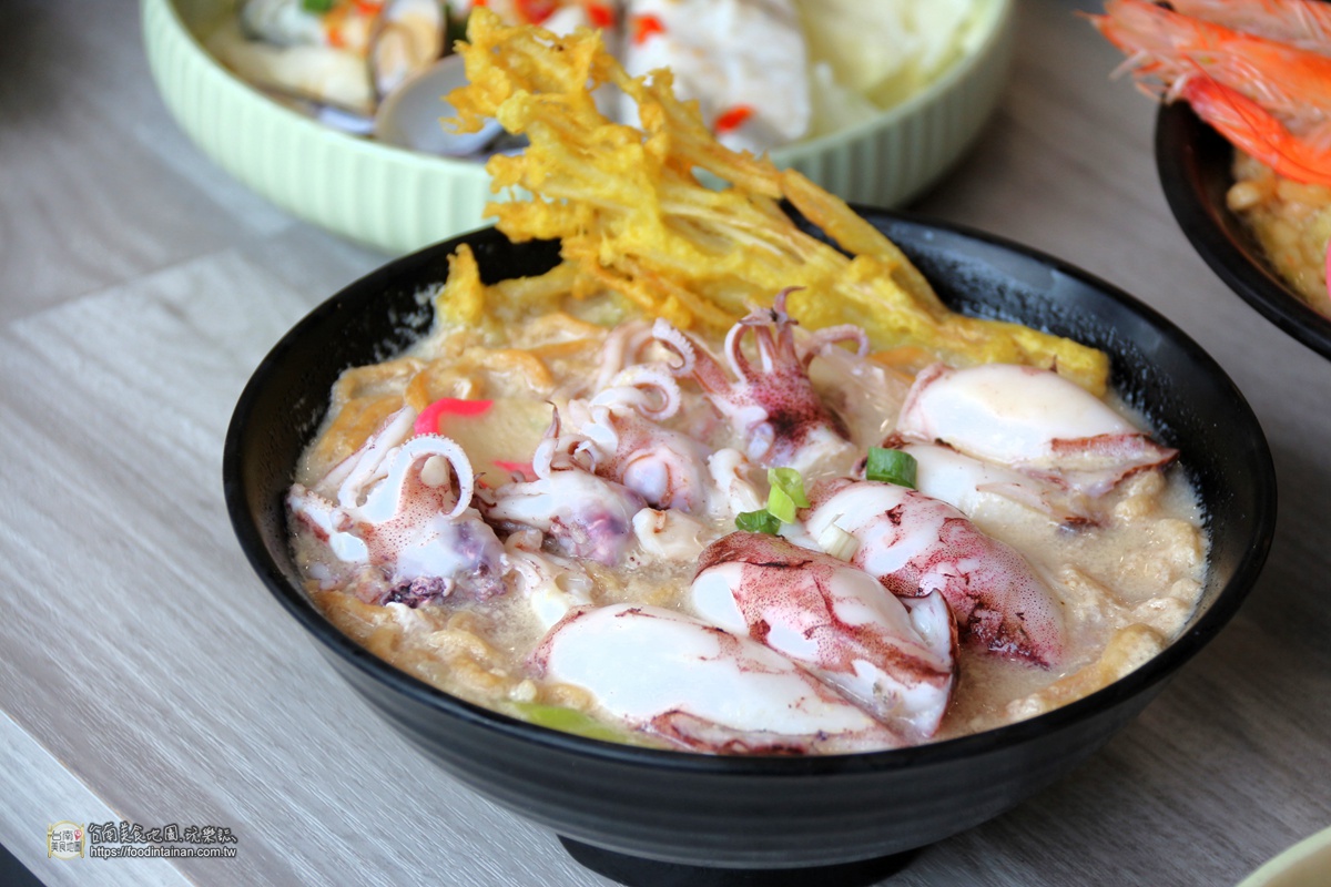 干貝、小卷、 鮮蚵、蛤蜊、白蝦等五種海鮮組合的招牌五福鍋燒意麵, 搭配炸的酥脆的炸金針菇,及師傅加入海鮮醬特製的蟹黃風味湯頭,湯鮮味美料好澎湃,喜歡吃海鮮的朋友千萬別錯過!※意麵可加購換烏龍麵、鐵棍粉絲※