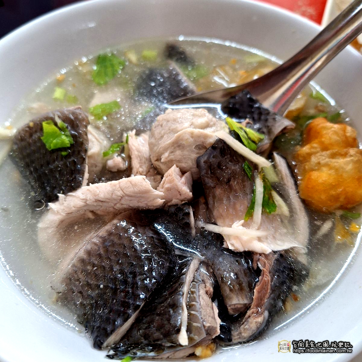 碗中放滿魚肉塊與魚皮,湯頭清甜,翠綠蔥花點綴出清爽感,魚皮嫩中帶Q,一看就知道新鮮現煮。