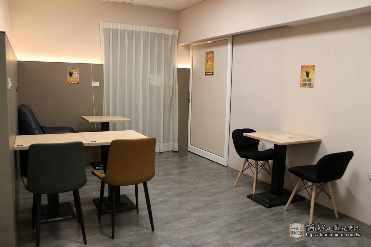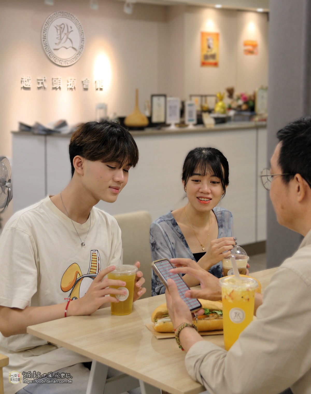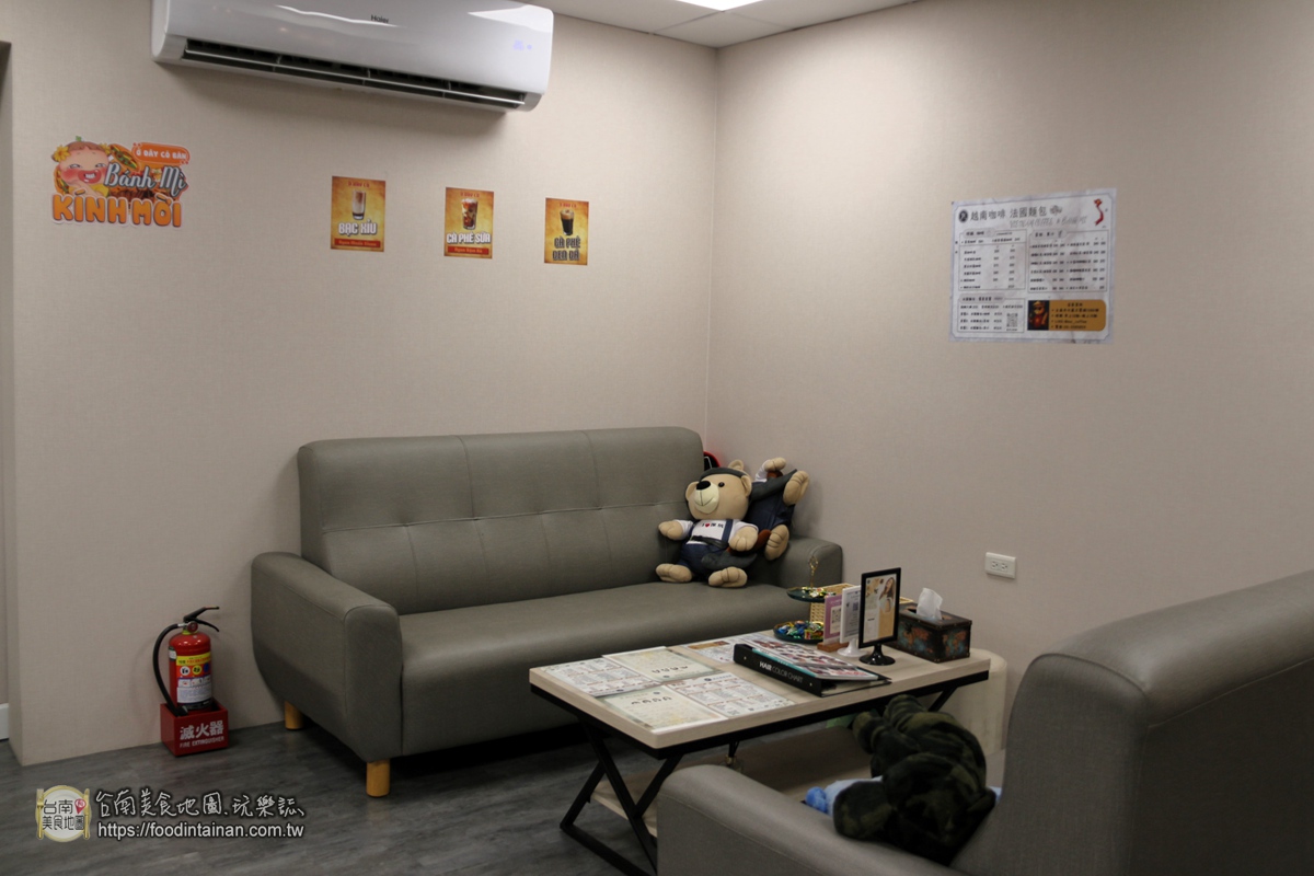 默 越南咖啡法國麵包在大門進來左手邊屏風前和後面小廳,設置用餐休息區並冷氣開放。而且在柱子旁邊的座位更有設置插座,免費提供給內用客人使用好方便~即使不體驗頭療也沒關係,一樣能來這裡輕鬆享受道地越式美食與悠閒下午茶。