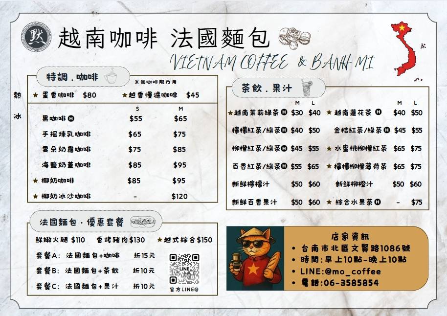 默 越南咖啡法國麵包提供鮮嫩火腿、香烤豬肉、越式綜合共3種口味的越南法國麵包,搭配特調咖啡或茶飲果汁,享有套餐優惠折扣~