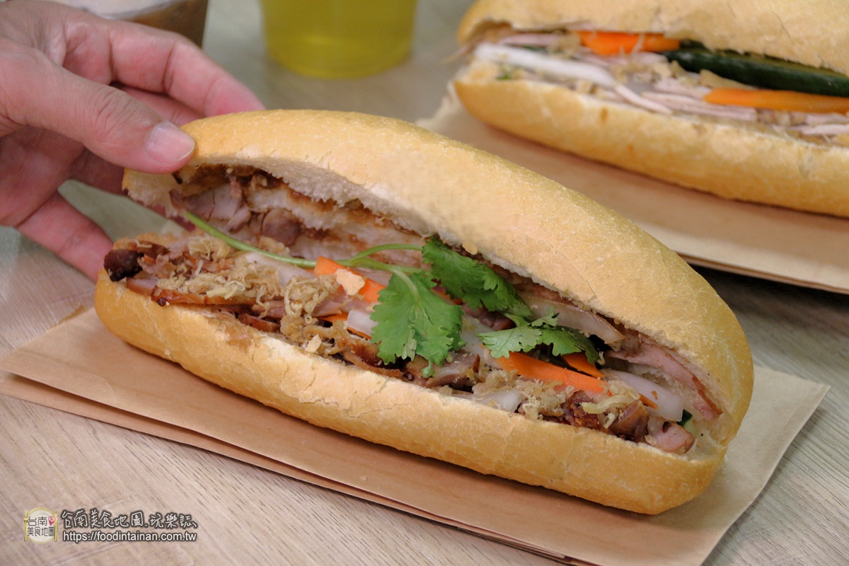 越南闆娘每天到菜市場買新鮮溫體梅花豬肉,抹上用越南醬、魚露等特調醬料烤製而成。切成片狀再搭配豬肝醬、蘿蔔泡菜、越南肉鬆及香菜等配料,一口咬下酥脆的麵包裡是滿滿的餡料!加上闆娘自炒的辣椒醬讓香烤豬肉法國麵包更辛辣開胃❤