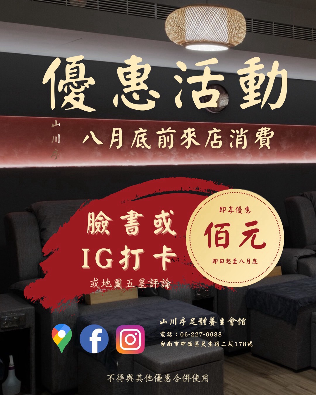 即日起到114年8月底前,到店消費於FB、IG打卡,或GOOGLE MAP五星評論,即享佰元優惠!(不得與其它優惠合併使用)