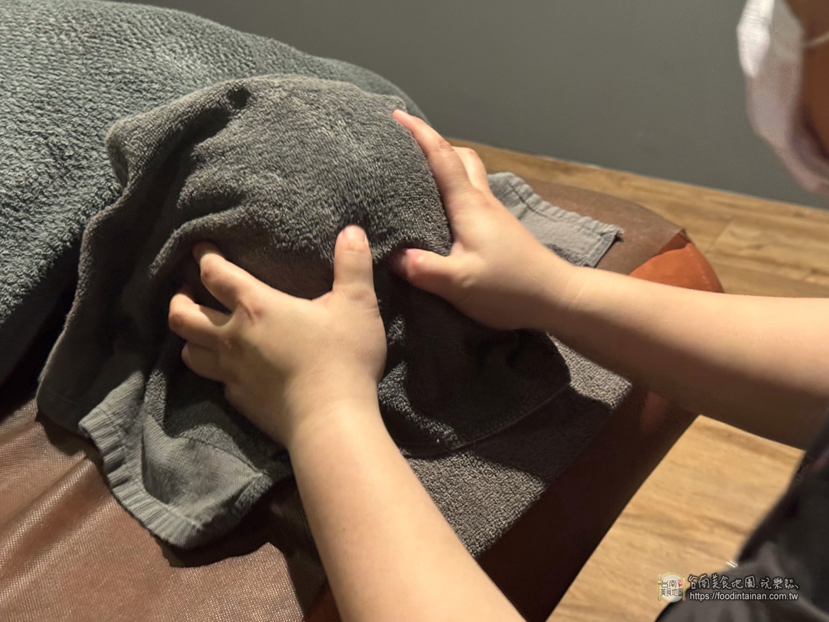 腳底按摩到尾聲時,師傅會拿來熱毛巾,從腳底到膝蓋整個小腿做熱敷、按壓及敲打等動作,就是要更增進腿部的代謝循環、適放足底壓力~