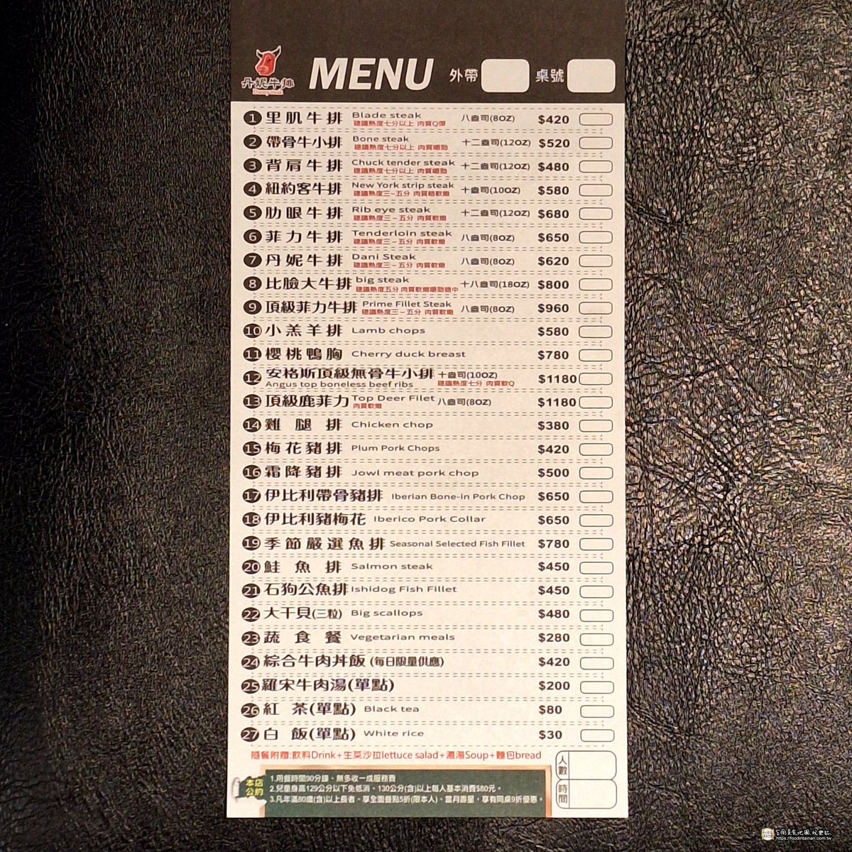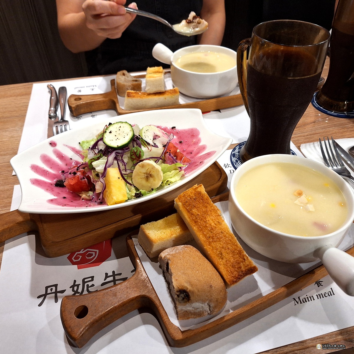 總共提供10多種餐點品項,有安格斯牛排、櫻桃鴨胸、雞腿排、霜降豬排(松阪豬)等等,每份套餐均附濃湯、沙拉、麵包和飲料,可續點(沙拉除外)~