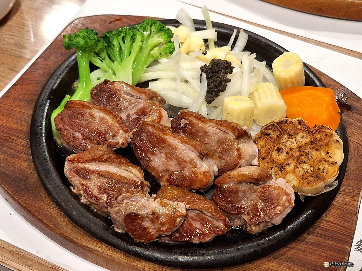 原肉煎烤的櫻桃鴨胸,鴨胸肉不柴多汁且鴨皮脆口,佐黑松露醬風味更有層次。搭配的烤蒜頭及蘑菇,都用鐵板煎過香氣更迷人~