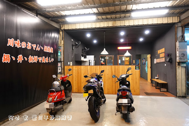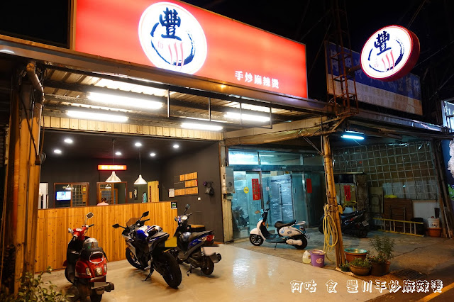 豐川手炒麻辣燙位於東區崇善路上,大紅色的招牌與燈火通明的店面在暗夜中相當顯眼;騎樓處可停放機車。