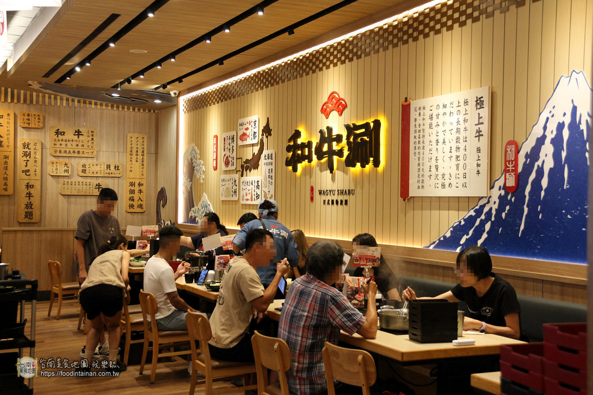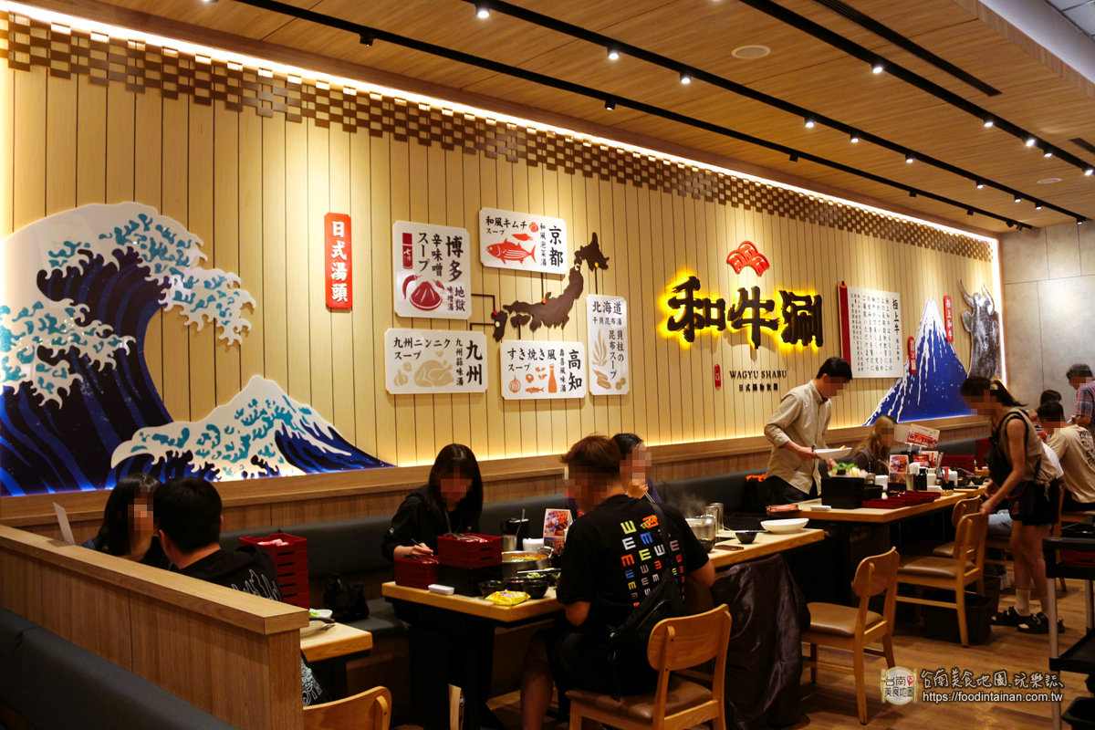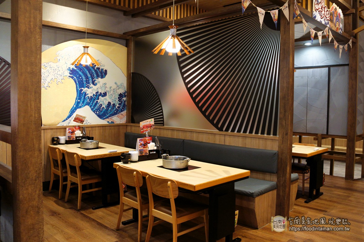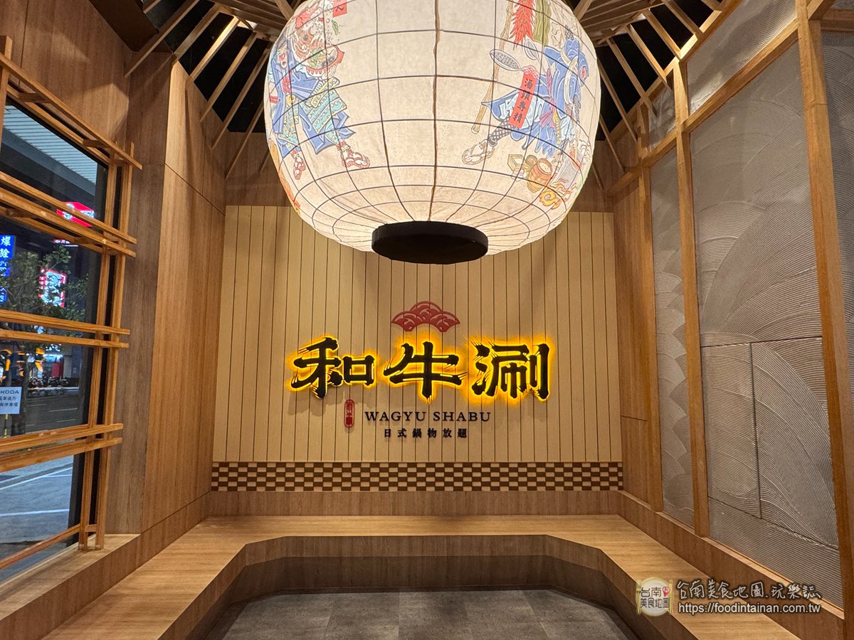 和牛涮台南店候位區懸掛的日式燈籠也太好拍,木質餐桌椅配上極具形像的日式插畫,帶著濃濃東洋氛圍很讚!全店共提供126席座位,適合公司行號、工商團體等聚餐吃飯~