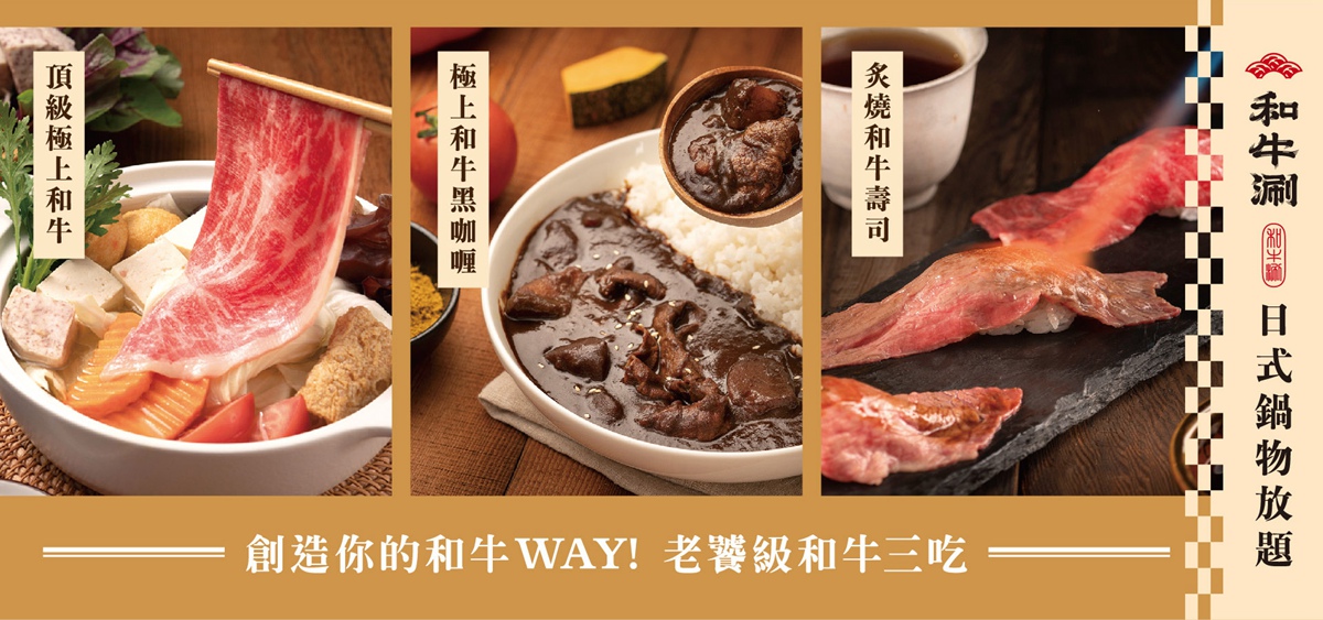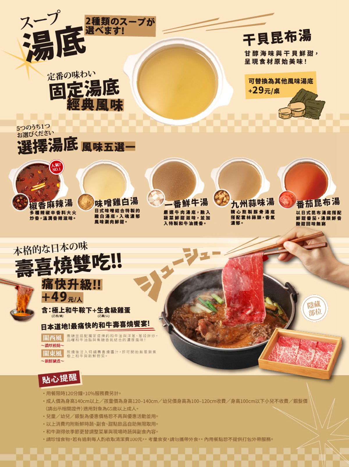 和牛涮 日式鍋物放題114/9/15~11/30推出秋季限定美食究極和牛壽喜燒雙吃!先煎後湯的鴛鴦雙鍋兩吃,一邊涮火鍋、一邊涮壽喜燒,盡享關東+關西風味的壽喜燒美味~還有炙燒和牛壽司、焦糖鯛魚燒等不用加價購就能通通吃到飽!